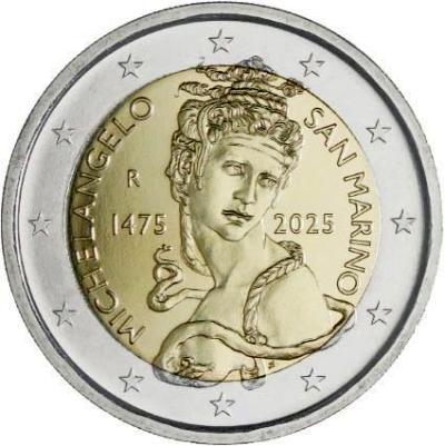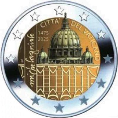 Popis: Motívom mince je kupola Baziliky svätého Petra, ktorú navrhol Michelangelo a na ktorej pracoval až do svojej smrti v roku 1564. Pod ňou je časť klenby Sixtínskej kaplnky, ktorú Michelangelo rozdelil na sekcie a vyzdobil freskami. Vľavo je vertikálne umiestnený Michelangelov autentický podpis „michelagniolo“, písmeno „R“ označujúce rímsku mincovňu a meno autorky vzoru mince „D. LONGO“ (Daniela Longo). V polkruhu nad kupolou je nápis „CITTA’ DEL VATICANO“ označujúci názov vydávajúcej krajiny. Hneď pod ním je rok narodenia Michelangela „1475“ a rok vydania „2025“. Vo vonkajšom prstenci mince je vyobrazených dvanásť hviezd vlajky Európskej únie.