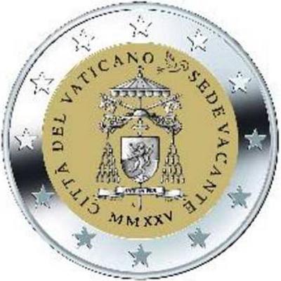 Popis: Na vzore mince je vyobrazený erb kardinála pôsobiaceho v úlohe kamerlenga. Erb je umiestnený pod symbolom Apoštolskej komory, ktorú predstavujú dva skrížené kľúče, nad ktorými sa klenie baldachýn (tzv. pavilón). Pozdĺž okraja mince sú vyryté nápisy „CITTA’ DEL VATICANO“ a „SEDE VACANTE“ a nápis „MMXXV“ označujúci rok vydania. Medzi nápismi „CITTA’ DEL VATICANO“ a „SEDE VACANTE“ je abstraktne vyobrazená holubica. Pod erbom kamerlenga je písmeno „R“označujúce rímsku mincovňu. Na ľavom dolnom okraji je meno rytca mince a na pravom okraji mince je meno jej autorky „O. ROSSI“ (Orietta Rossi). Vo vonkajšom prstenci mince je vyobrazených dvanásť hviezd vlajky Európskej únie.