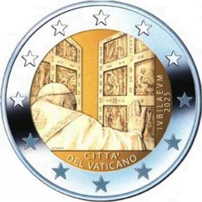 Popis: Na vzore mince je vyobrazený motív otvárania Svätej brány Baziliky svätého Petra. Vpravo je vertikálne umiestnený latinský nápis „IVBILAEUM“ a nápis „2025“ označujúci rok vydania mince. Dole v polkruhu je nápis „CITTA’ DEL VATICANO“ označujúci názov vydávajúcej krajiny. Na dverách je písmeno „R“označujúce rímsku mincovňu. V ľavej dolnej časti motívu je je nápis „D. LONGO“ označujúci meno autorky mince (Daniela Longo). Vo vonkajšom prstenci mince je vyobrazených dvanásť hviezd vlajky Európskej únie.